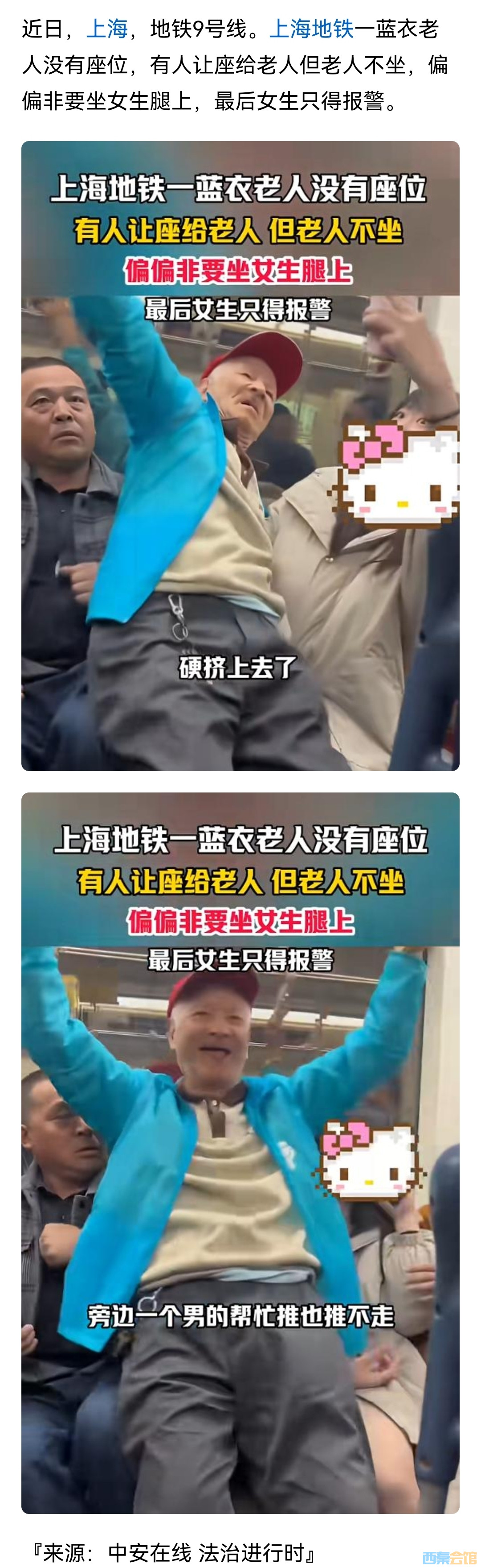 上海地铁一老人非要坐女生腿上,女生无奈报警