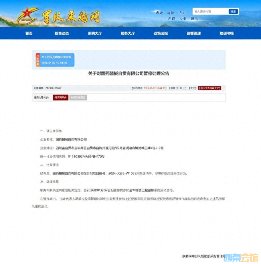 因“借用资质”违规 国药器械自贡有限公司被暂停全军采购资格