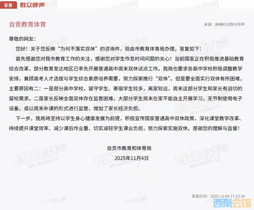 为何自贡学校没有全面落实“双休”?官方解答