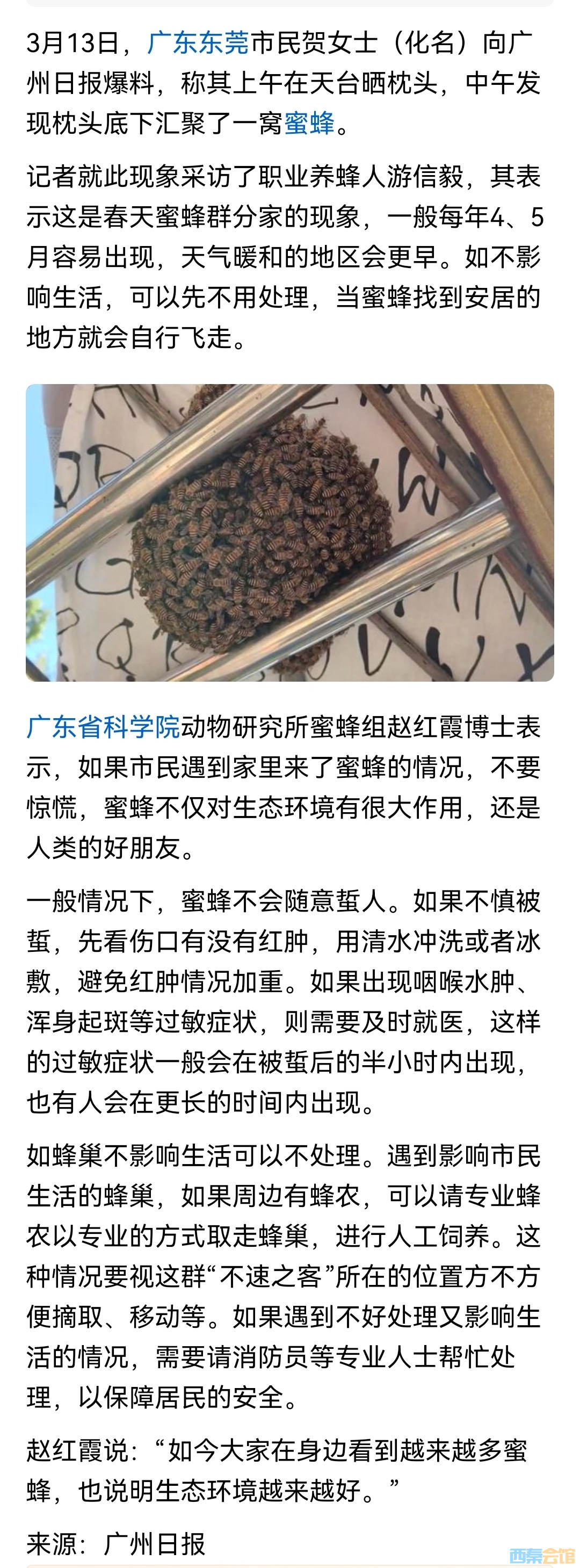 广东一女子在天台晒枕头,结果枕头下聚了密密麻麻一窝蜜蜂