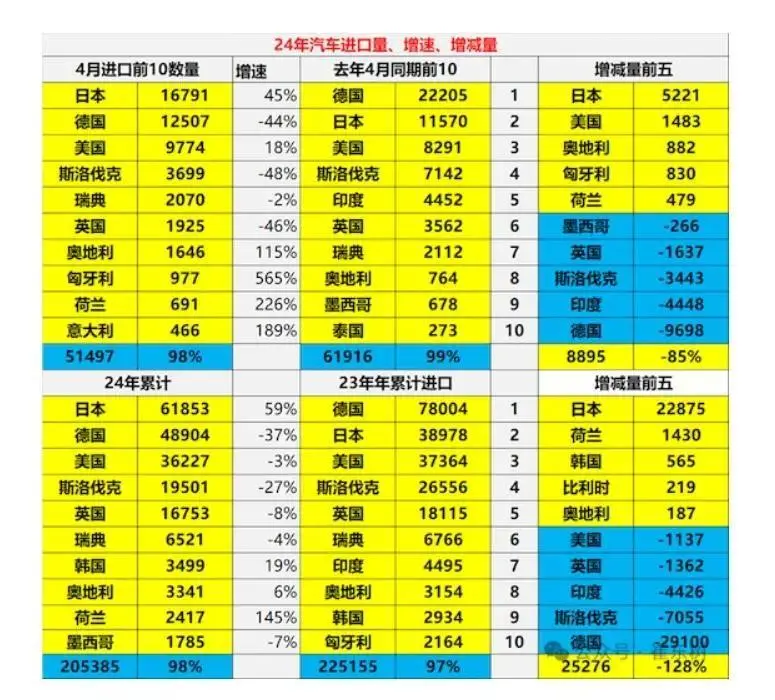 如上图所示,可以看到,中国24年的前4个月,从日本进口了6.19万辆汽车,从德国进口了4.89万辆,从美国进口了3.62万辆汽车。