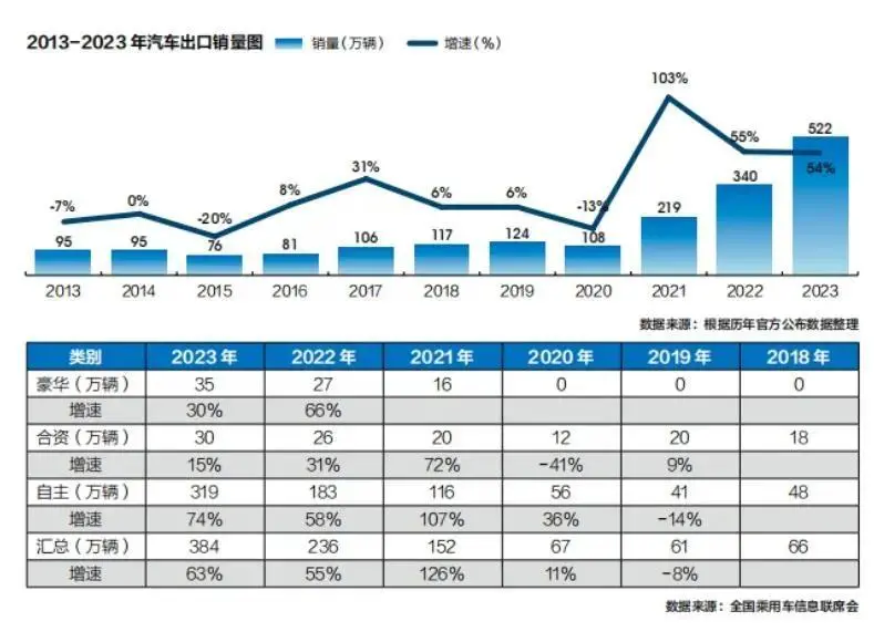 而数据显示,中国汽车出口量,这几年一直在疯狂增长,特别是从2021年开始,中国新能源汽车高速发展,于是进入2021年之后,汽车出口量也上了一台新台阶。