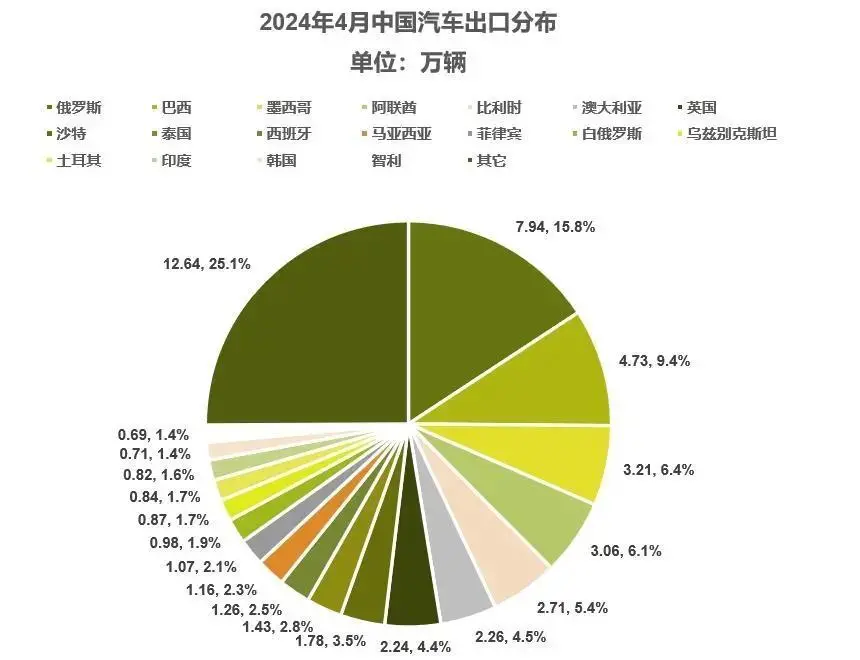 而2024年4月份, 这50.4万辆汽车出口中,俄罗斯依然是最大出口目的国,占到7.94万辆,占比为15.8%,比2023年低了一些。