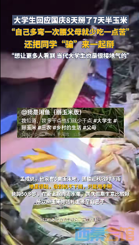 这是大学生孟成感动网友的两句话,他用不算宽厚但结实有力的肩膀,在5亩地间,将玉米一个个掰下,一摞摞装筐。整个国庆假期,他都在苞米地里,直至假期最后半天,他带上几截玉米返回学校。