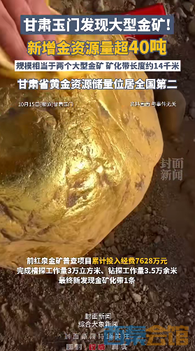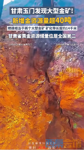 据甘肃省自然资源厅获悉,甘肃省玉门市前红泉—黑山北滩地区新发现一处大型金矿,新增金资源量超40吨,规模相当于两个大型金矿的资源量。