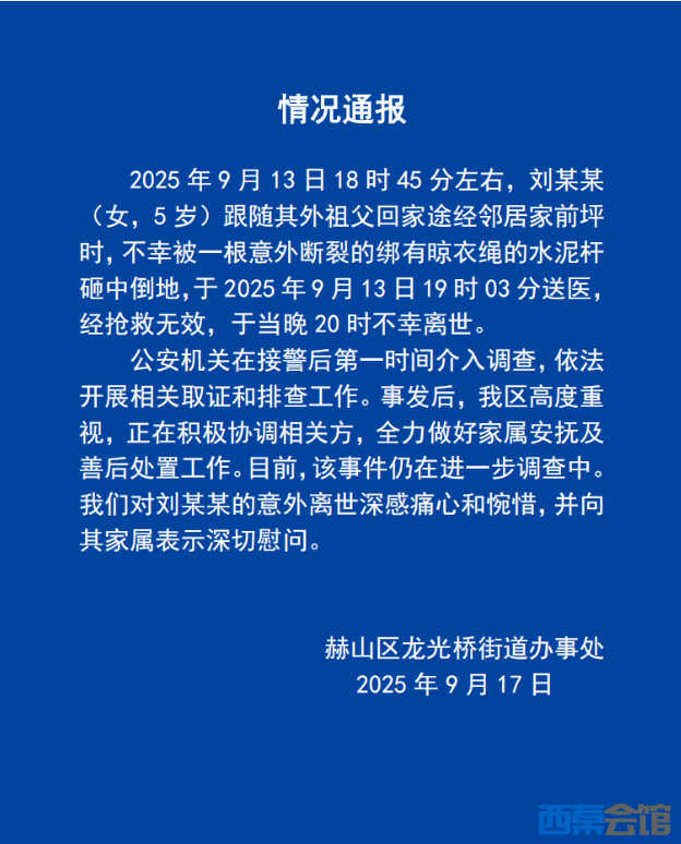据龙光桥街道办事处17日通报,9月13日18时45分左右,刘某某(女,5岁)跟随其外祖父回家途经邻居家前坪时,不幸被一根意外断裂的绑有晾衣绳的水泥杆砸中倒地,于当天19时03分送医,经抢救无效,于当晚20时不幸离世。公安机关在接警后第一时间介入调查,依法开展相关取证和排查工作。事发后,相关部门正积极协调相关方,全力做好家属安抚和善后处置工作。目前该事件仍进一步调查等。