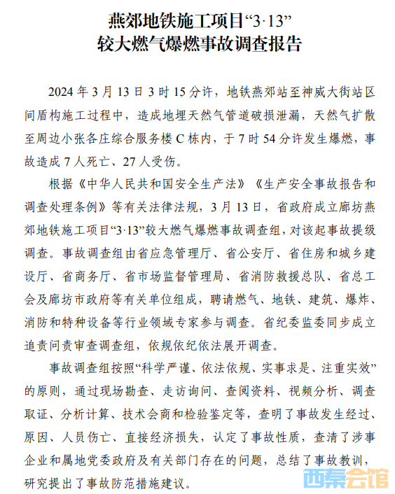 燕郊地铁项目爆燃事故致7死27伤,调查报告公布