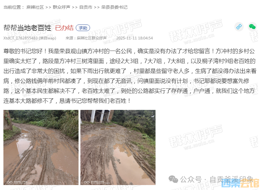 尊敬的书记您好!我是荣县观山镇方冲村的一名公民,确实是没有办法了才给您留言!方冲村的乡村公里确实太烂了,路段是方冲村三树湾里面,途经2大3组,7大7组,7大8组,以及桐子湾村9组老百姓的出行造成了非常大的困扰,如果下雨出行就更难了,村里都是些留守老人多,生病了都没得办法出来看病,修公路钱俩年前村民都凑了,到现在都了无音讯,问镇里面说没有计划,书记耶都说要想富先修路,这个基本民生都解决不了,老百姓太难了,到处的公路都实行了存存通,户户通,就我们这个地方连基本大路都修不了,恳请书记您帮帮我们老百姓!