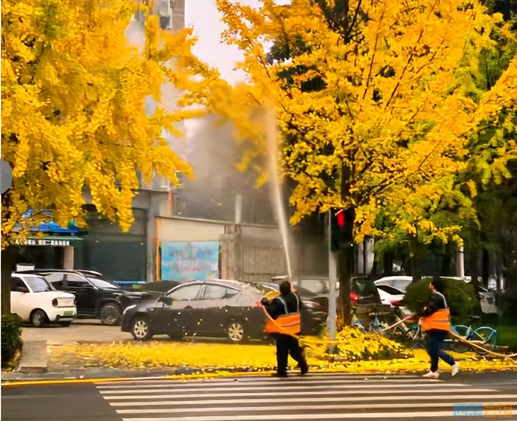 四川眉山被曝多名环卫工用高压水枪冲刷银杏叶,环境卫生管理所:..