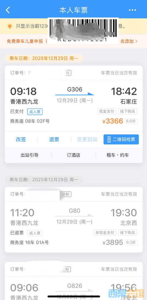 18日,杨女士向封面新闻记者,前两张高铁票的购票短信是在16日凌晨2点45分和凌晨4点12分发来的。“我早上起来上厕所,就发现了,觉得很奇怪。”杨女士登录自己的12306账号发现,一张票是G80次,12月29日上午11点20分从香港西九龙发车前往北京西的商务座票;一张票是G826次,12月29日上午9点06分从香港九龙西发车前往西安北的商务座票。“两个时间有重叠。”