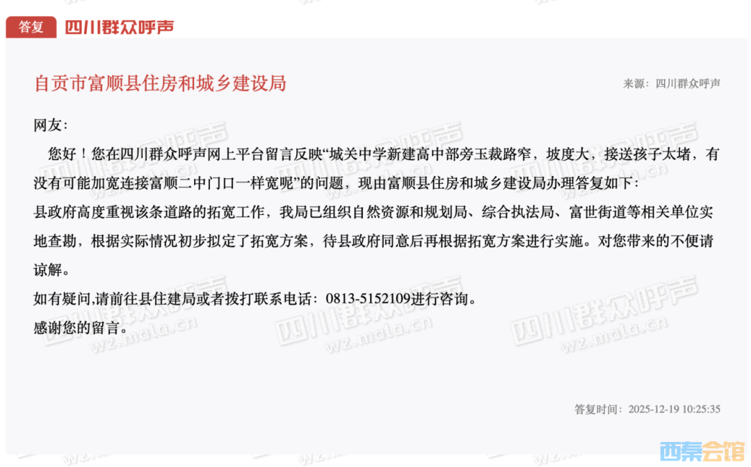 您好!您在四川群众呼声网上平台留言反映“城关中学新建高中部旁玉裁路窄,坡度大,接送孩子太堵,有没有可能加宽连接富顺二中门口一样宽呢”的问题,现由富顺县住房和城乡建设局办理答复如下: