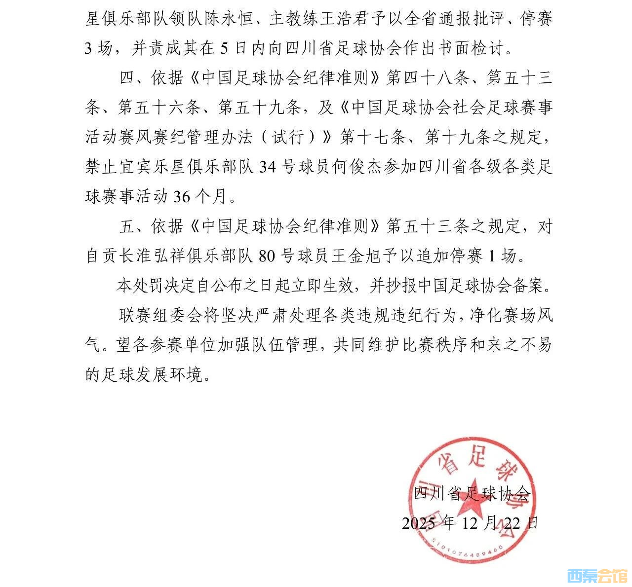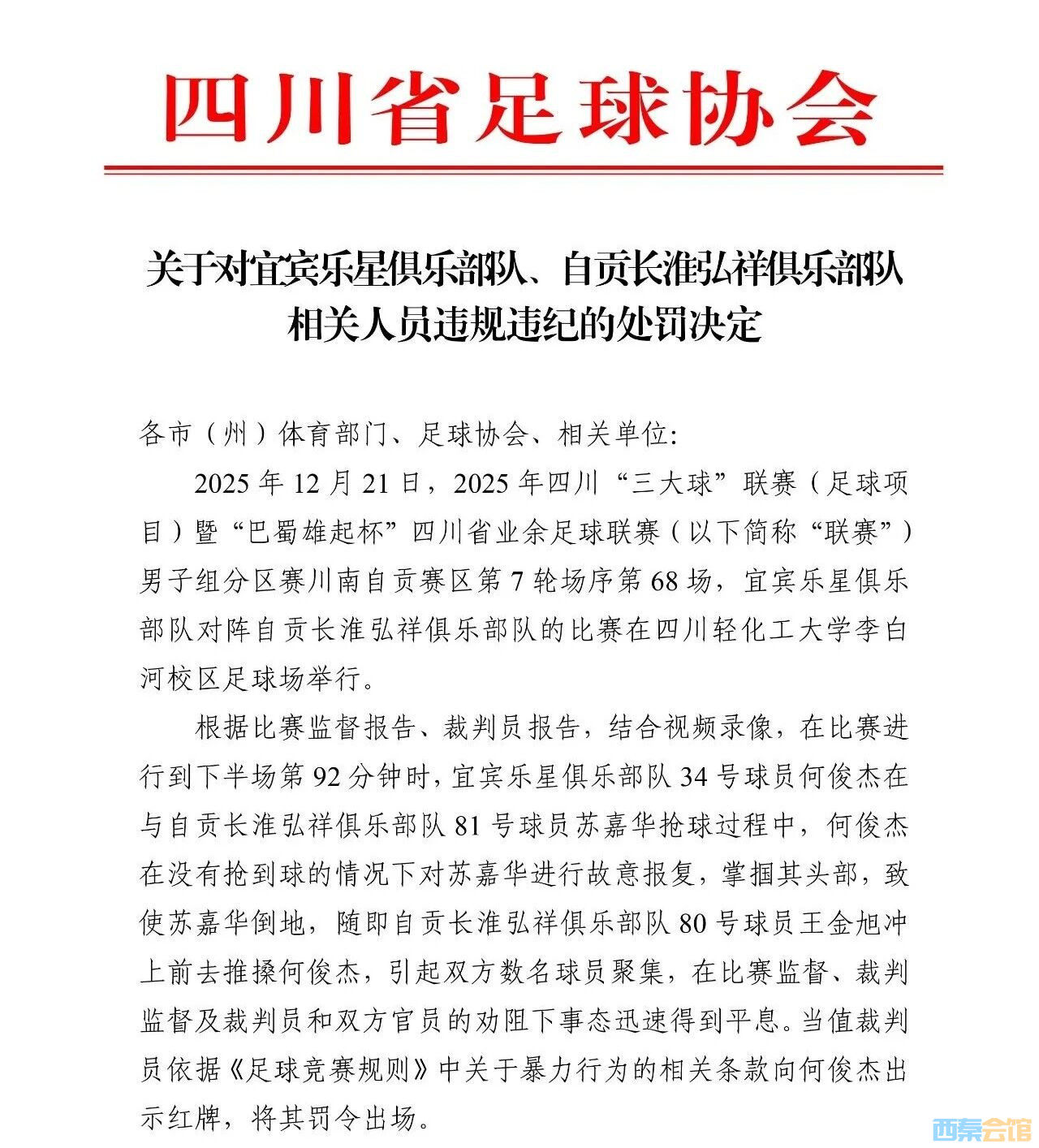 12月21日,在2025年四川“三大球”联赛(足球项目)暨“巴蜀雄起杯”四川省业余足球联赛宜宾乐星俱乐部队(简称“宜宾队”)与自贡长淮弘祥俱乐部队(简称“自贡队”)的比赛中,宜宾队球员何俊杰对自贡队球员苏嘉华进行故意报复,掌掴苏嘉华头部,引发双方冲突。12月22日,四川省足球协会发布官方通告,对涉事双方作出处罚决定。