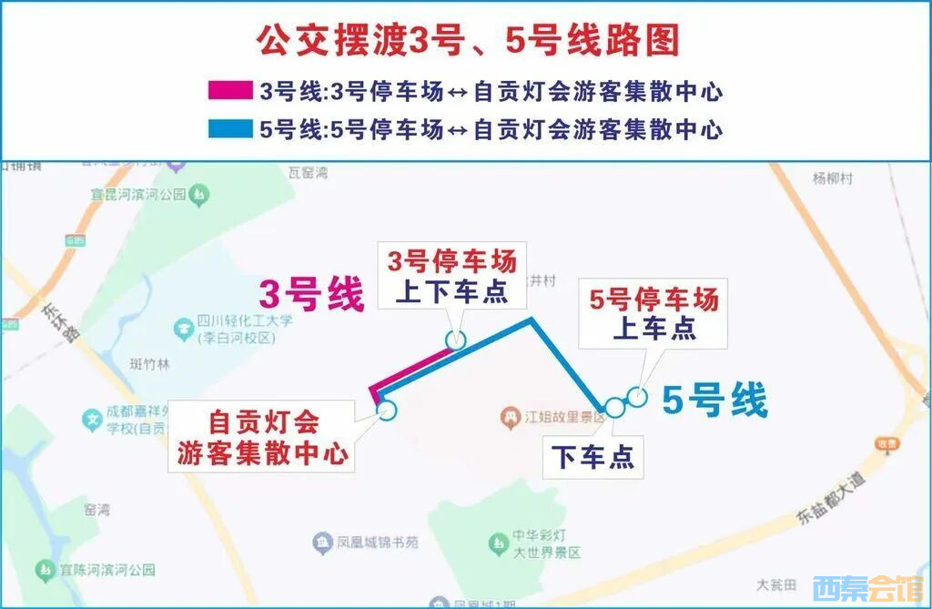 导航停车在3号、5号停车场及应急停车区的游客,可免费乘坐3号、5号园区摆渡专线和应急摆渡观灯专线前往自贡灯会游客集散中心。