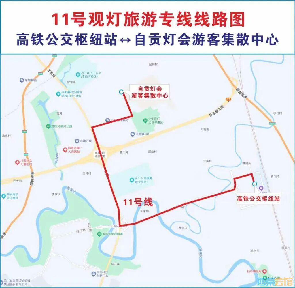 乘坐高铁到市观灯的游客,可以在高铁自贡站公交枢纽站,乘坐11号公交观灯专线前往自贡灯会游客集散中心。