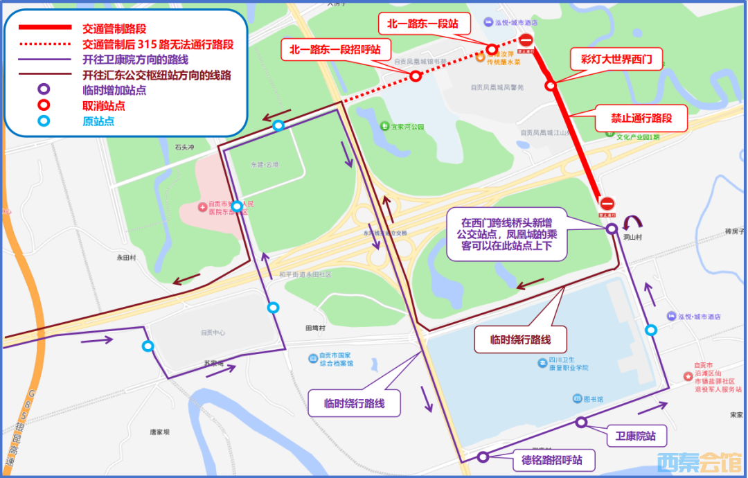接相关部门通知(第三十二届自贡国际恐龙灯会期间部分道路实行临时交通管制措施,必看→),2026年1月23日起,将对灯城中街进行交通管制,届时影响315路公交车运行路线,现将道路管制期间315路绕行情况下整理如下: