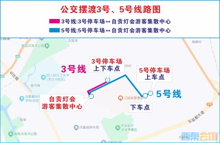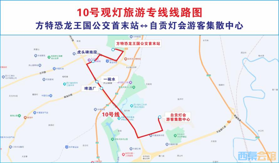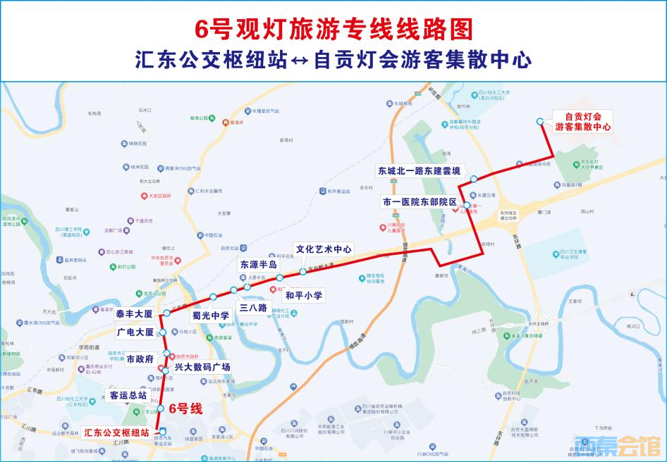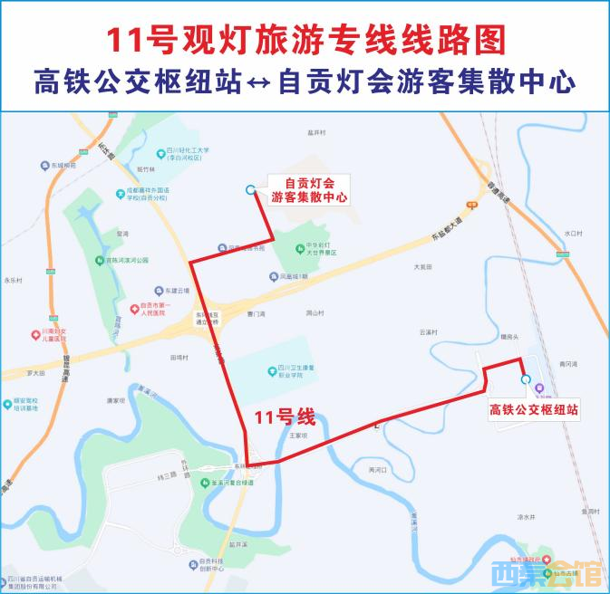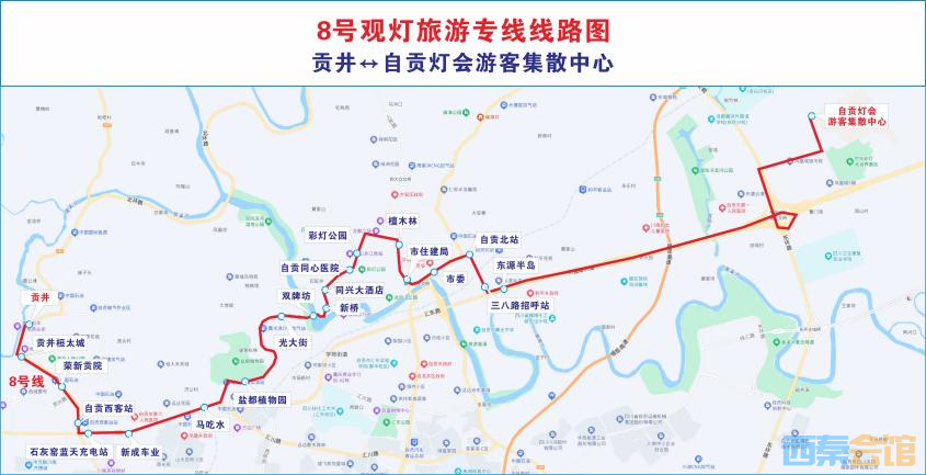 1.线路走向及停靠站点:贡井→贡井桓太城→荣新贡院→自贡西客站→石灰窑蓝天充电站→新成车业→马吃水(川南建材市场)→盐都植物园→光大街→双牌坊→新桥→同兴大酒店→自贡同心医院→彩灯公园→檀木林→市住建局→市委→自贡北站(火车站)→三八路(招呼站)→东源半岛→公交游客集散中心。串联老城区多个站点,市民出行超方便。2.计划班次时间:(1)贡井:16:00、17:00、18:00、19:00、20:00(2)公交游客集散中心:18:00、19:00、20:00、21:00、22:00、23:00(周五、周六末次车23:30)(3)2026年2月15日至23日,贡井首班车15:00,公交游客集散中心末班车24:00(除夕夜闭园,专线停发)。(4)2026年2月24日至3月3日,贡井首班车15:00,公交游客集散中心末班车23:30(5)2026年1月21日为试展,1月23日为开幕式,首班车发车时间为开园前60分钟,末班车为关灯后30分钟。3.线路运行图