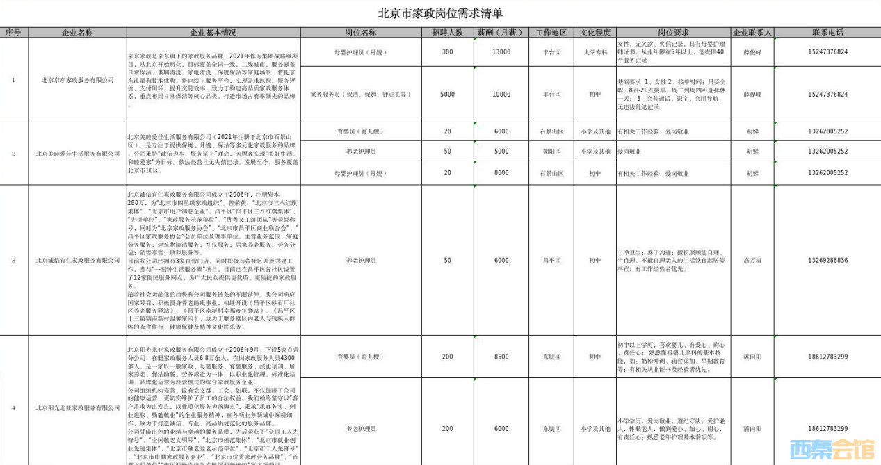 近期,自贡市人力资源和社会保障局精准对接春节期间北京市用工需求,为大家带来46家优质企业的家政类岗位,涵盖养老护理员、母婴护理员、育婴员、家务服务员等101个岗位,总招聘人数达14620人。如有就业需求,请及时与企业电话联系。