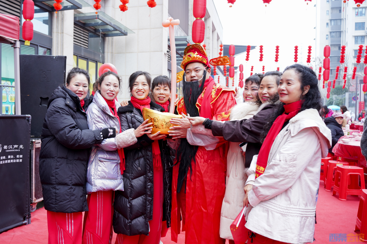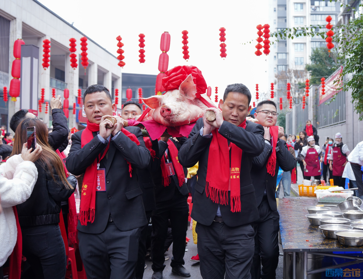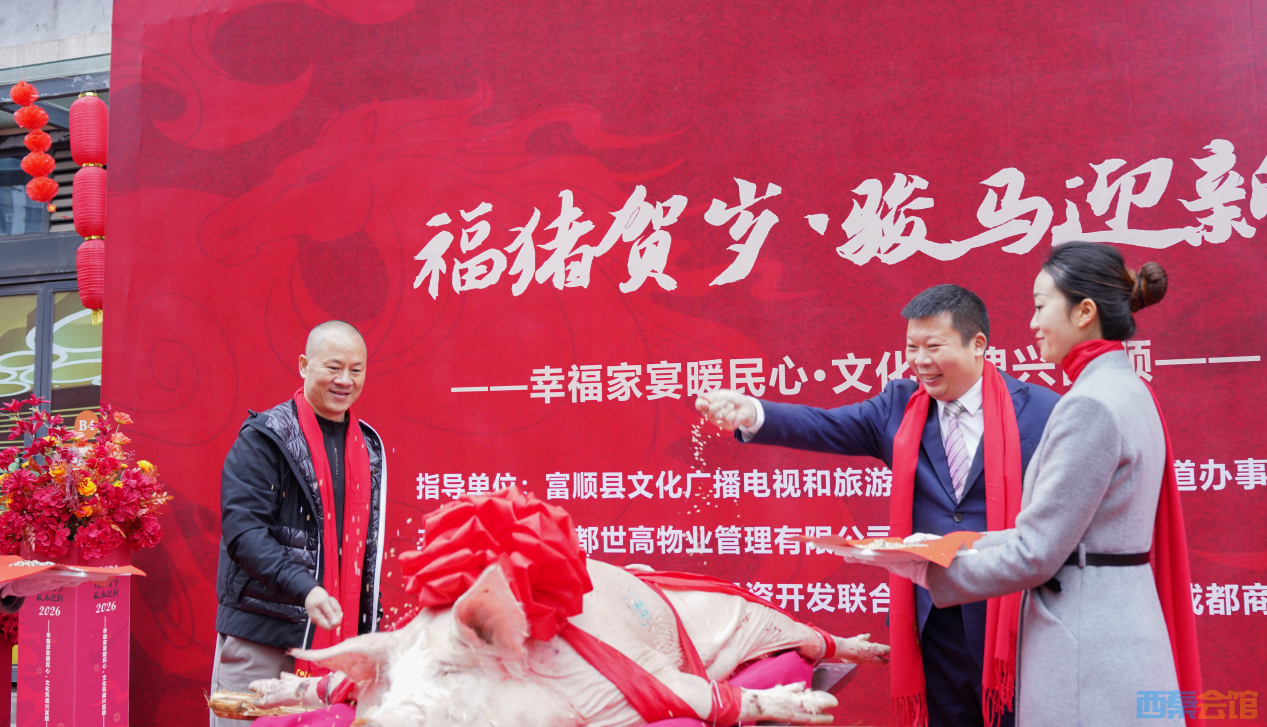 本次活动特别设计了富有仪式感的“吉猪纳吉”环节。在财神、四大才子的引领下,金猪登台,寓意五谷丰登、文脉绵长。富顺县总商会成都会长王万安、副会长吴尚锟共同登台撒五谷祈福,祈愿家园和睦、日子富足。随后庖丁师傅启刀纳吉,将传统年俗与现代社区活动巧妙融合,引来阵阵掌声。