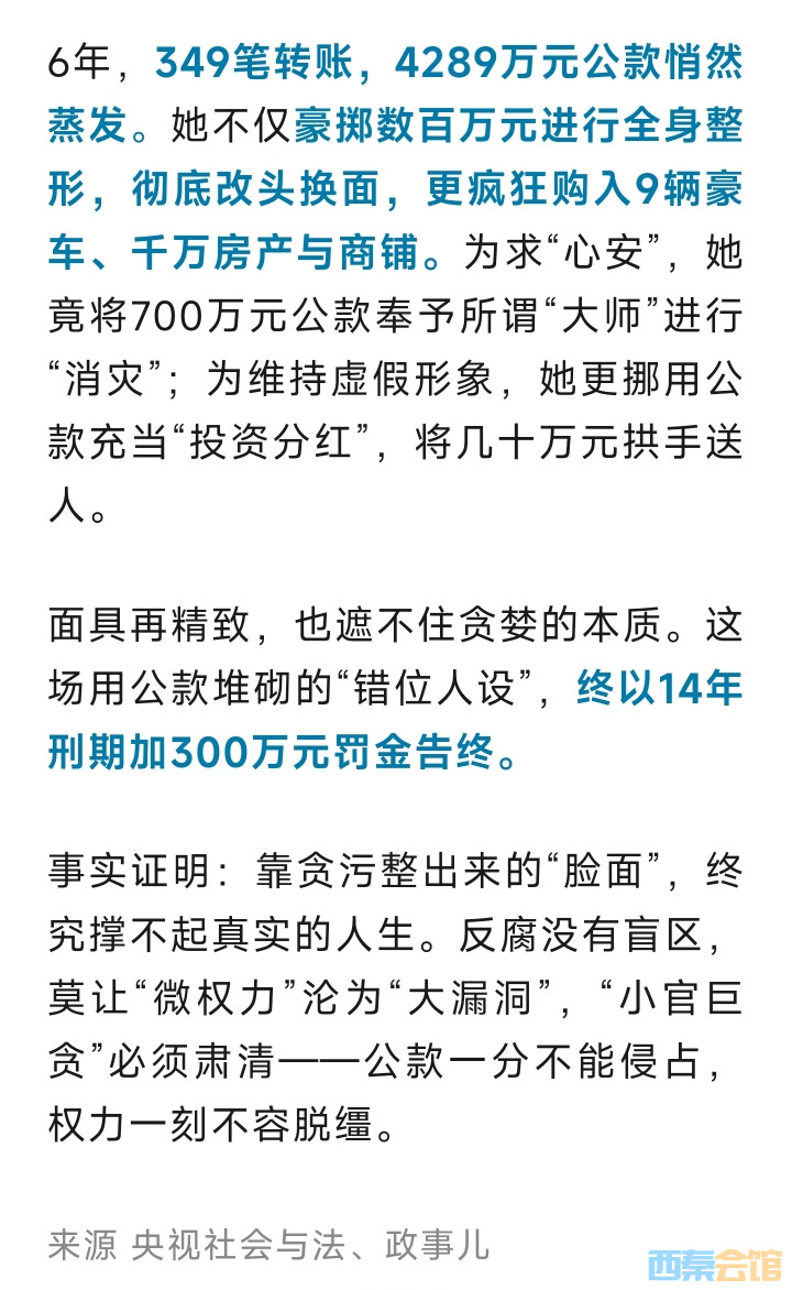 官方披露:一出纳6年侵吞公款4289万元,豪掷数百万元进行全身整容……