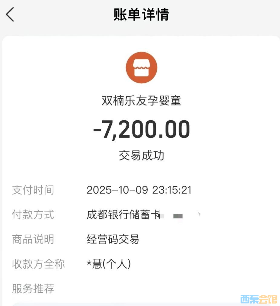有宝妈晒出自己的交易截图,截图显示,2025年10月9日晚上11点多,她通过二维码向门店支付了7200元,备注是“经营码交易”,但收款方却是一个个人账户。