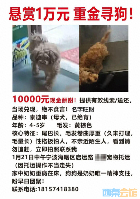 “我一定要带旺财回家,让奶奶不留遗憾!”近日,黑龙江鸡西市的姜女士为寻找托运途中走失的泰迪犬“旺财”,跨越2700多公里奔赴宁波,多次发帖悬赏1万元寻狗。