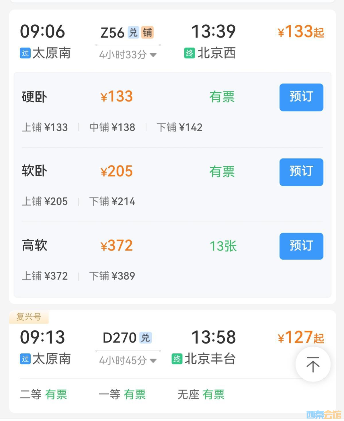 极目新闻记者打开“铁路12306”,高级软卧显示为“高软”,有高级软卧的车次不多,大多会出现在Z字头的车次。从票价来看,如从太原南到北京西的Z56次列车,高级软卧下铺389元,上铺372元,接近普通硬卧133元价格的3倍。