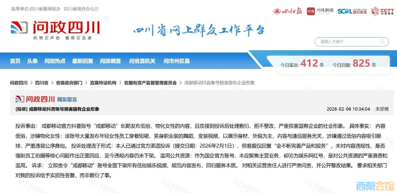 2026 年 2 月 6 日,有网友在相关平台留言投诉成都移动官方抖音账号 “成都移动”,直指该账号存在发布低俗内容、投诉处理敷衍、滥用公共资源等问题,认为其严重损害国有企业社会形象,该投诉当前状态为未受理。