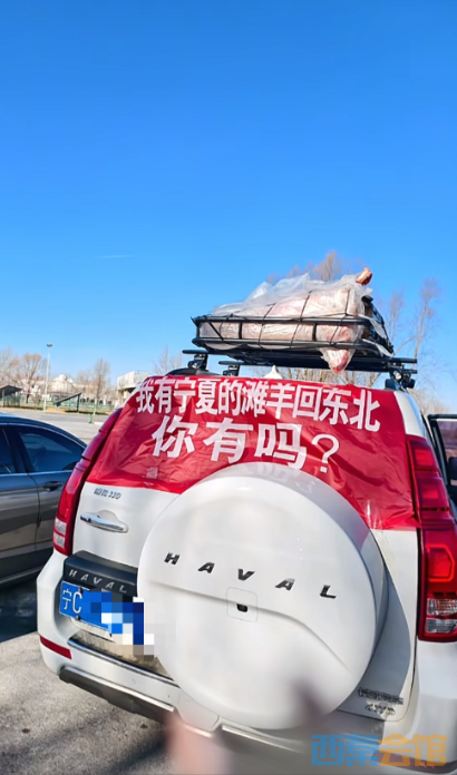 2月11日,多名网友发布视频称,在宁夏至黑龙江的公路上,偶遇一辆私家车挂着横幅“我有宁夏的滩羊回东北,你有吗”,车顶还固定放着一整只羊。