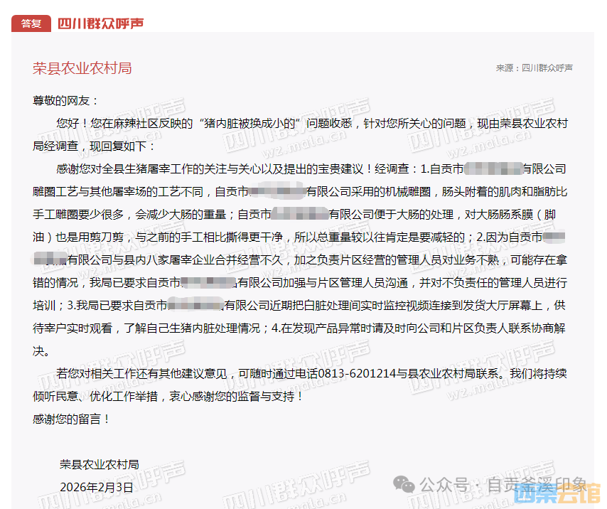 对此荣县农业农村局回复到您好!您在麻辣社区反映的“猪内脏被换成小的”问题收悉,针对您所关心的问题,现由荣县农业农村局经调查,现回复如下: