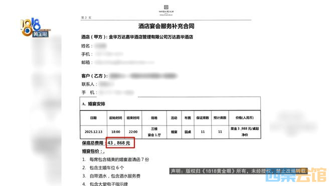 黄女士:是因为我看中了它的场地,事先过来跟主厨他们沟通了。希望我们的菜,第一个,因为是冬天,希望是热气腾腾的,第二的话食材新鲜。那第三的话,也不是说有多好吃,因为我们也知道婚宴可能众口难调,但是至少大家吃了之后,可能没什么说不好吃这种情况出现。试菜是要自己付费,那我想着就先算了,因为你这么大的酒店品牌,我觉得应该也不会太差的。