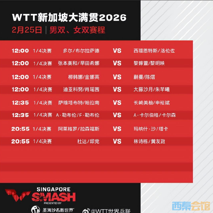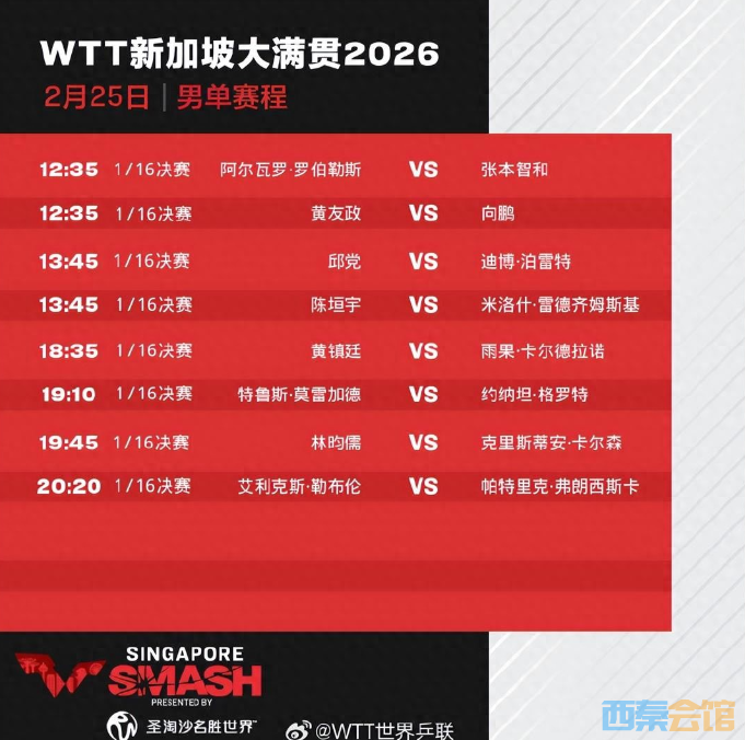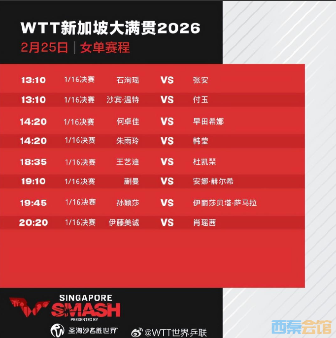 25日,2026年WTT新加坡大满贯进入正赛第四天,孙颖莎、蒯曼、向鹏、陈垣宇等出场。具体赛程如下: