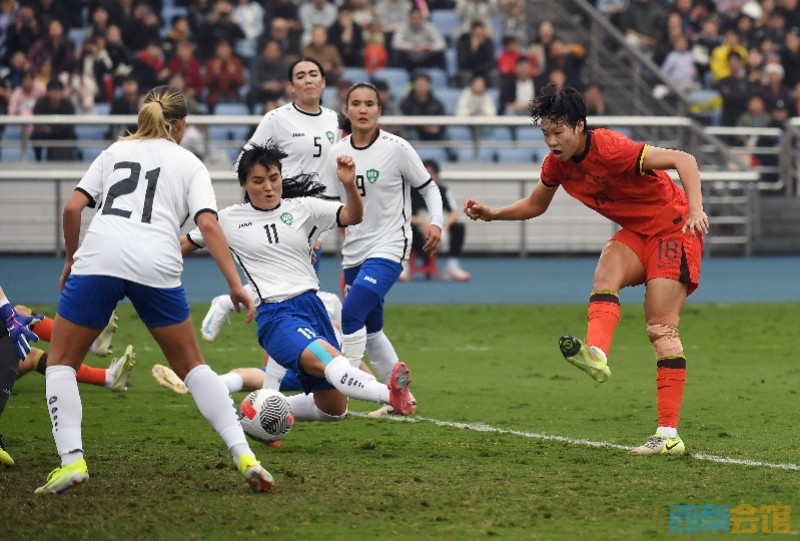 2025年4月5日,永川国际女足锦标赛,中国队球员邵子钦(右一)攻破乌兹别克斯坦队大门。新华社发
