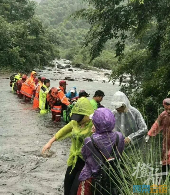 经过一夜的滂沱大雨,山涧小溪已汇合成湍急的河流,淹没了原有的过道,救援队员们手牵着手筑起一道道人墙,站在急流中,来回10多次让驴友们靠扶着安全顺利通过。